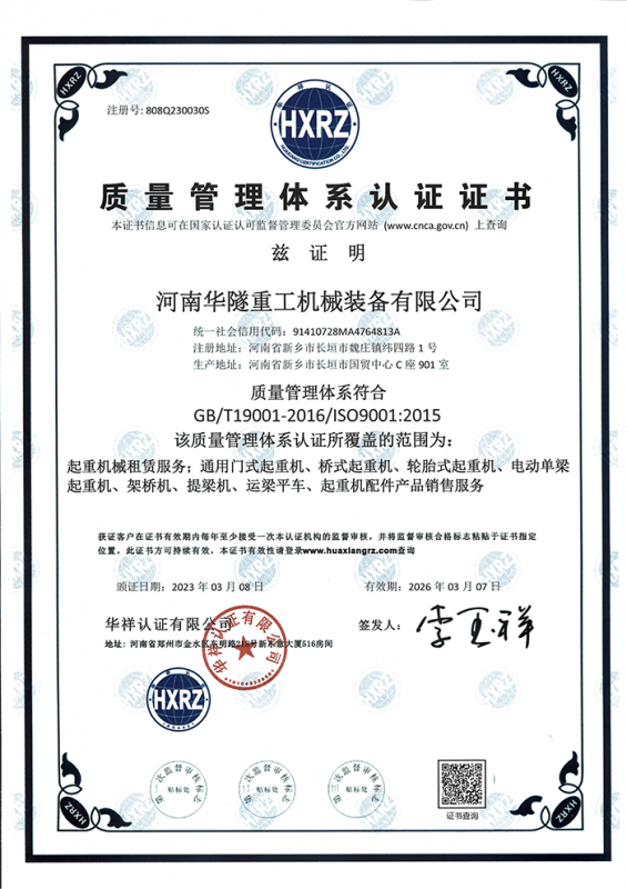 河南華隧重工機(jī)械裝備有限公司主要從事通用門式起重機(jī)、橋式起重機(jī)、電動(dòng)單梁起重機(jī),輪胎式起重機(jī)、架橋機(jī)、提梁機(jī)、遠(yuǎn)梁平車、鋼絲繩電動(dòng)萌蘆、卷揚(yáng)機(jī)、起重配件制造、銷售:起重機(jī)械租賃、安裝和維修,起重設(shè)備園收,機(jī)械設(shè)備維修,鋼結(jié)構(gòu)工程承包,橋梁工程及技術(shù)咨淘服務(wù),銷售五金制品、機(jī)電設(shè)備:建設(shè)工程監(jiān)理,建設(shè)工程設(shè)計(jì),各類工程建設(shè)活動(dòng),建筑勞務(wù)分包,建筑物折除作業(yè),施工作業(yè),工程管理服務(wù),土石方工程施工,裝如發(fā)運(yùn)。  公司已通過IS0國際質(zhì)量、環(huán)境、健康與安全三合一標(biāo)準(zhǔn)認(rèn)證,特種設(shè)備制造許可證和特種設(shè)備安裝改造維修許可證。擁有完熟的質(zhì)量管理體系。嚴(yán)格的管理制度,強(qiáng)大的生產(chǎn)能力和先進(jìn)的檢測手段,在保證產(chǎn)品質(zhì)量的同時(shí),也具備了極強(qiáng)的市場競爭力。  公司堅(jiān)持科技創(chuàng)新為理念,產(chǎn)品質(zhì)量為核心,注重信譽(yù),建立了減信可靠、快捷、思速。便利周到的售后服務(wù)網(wǎng)絡(luò)。  我們擁有的技術(shù)專家和技術(shù)服務(wù)隊(duì)伍為客戶提供充善的售前技術(shù)支持和全天候的售后服務(wù)體系,讓您無后顧之憂,享受一站式的超值服務(wù)。  “華隧重工,伴您成功“是華隧重工永遠(yuǎn)的宗指,真被的希望與各界朋友攜手并進(jìn)。共創(chuàng)輝準(zhǔn)!